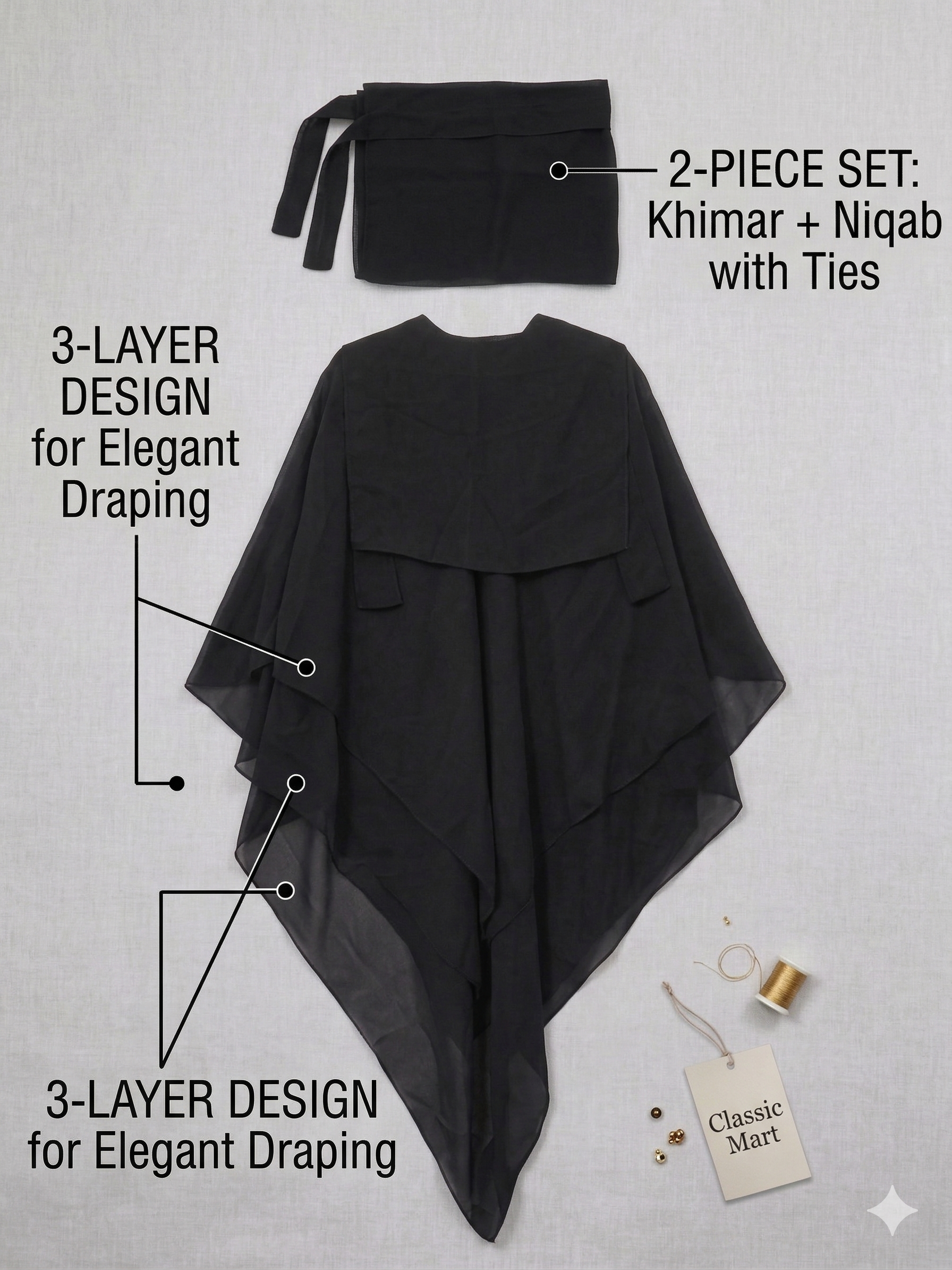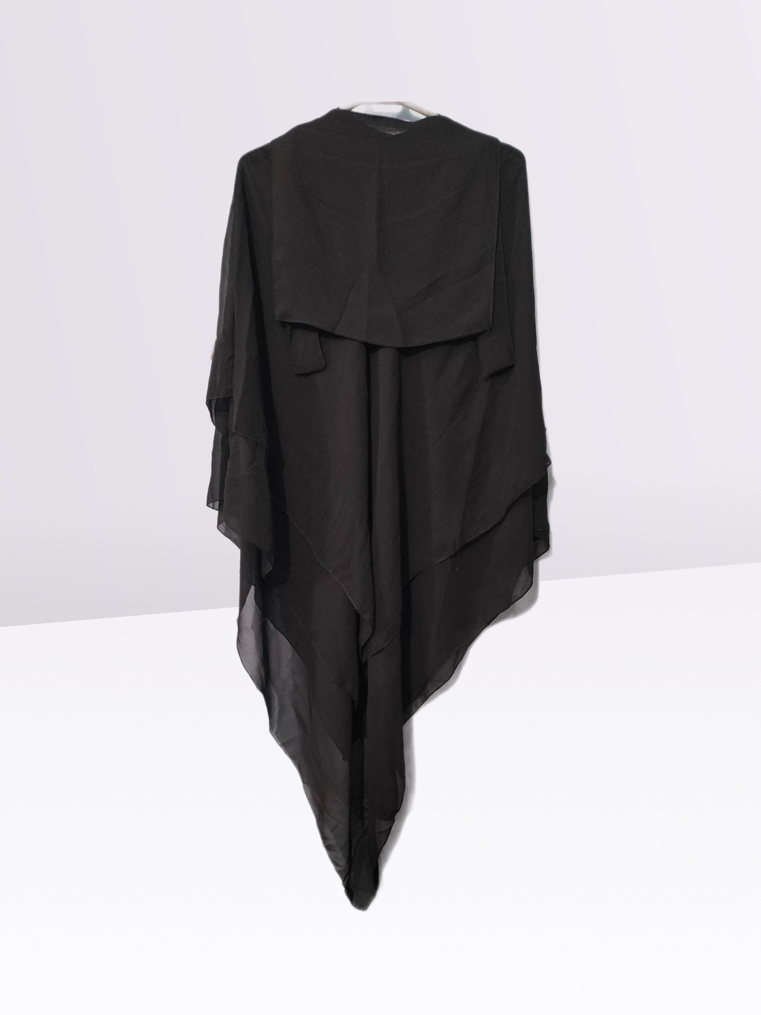 3 Layer Khimar Hijab Set with Niqab – Imported Chiffon 2 Piece Set | Free Size (Black)