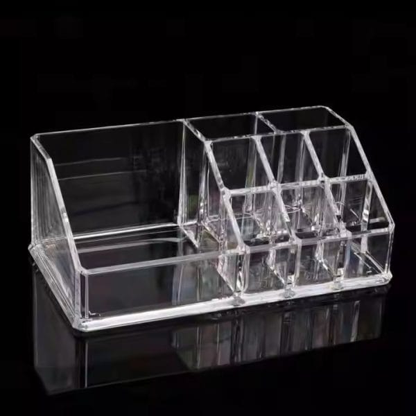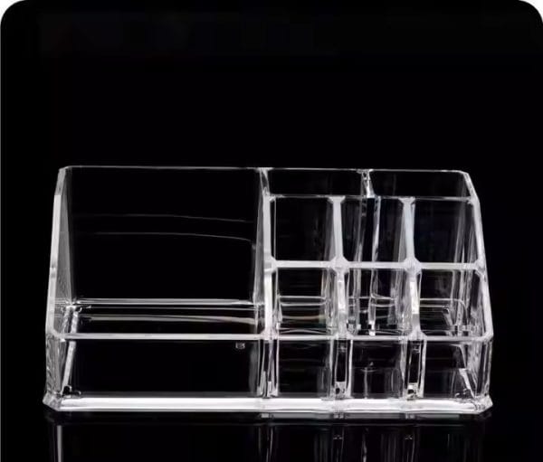 Acrylic Makeup Organizer Storage Box is a versatile and stylish solution for keeping your cosmetics and beauty essentials neatly organized. Crafted from durable acrylic material, this transparent organizer features nine compartments, each designed to accommodate a variety of makeup products. The clear design allows for easy visibility, making locating and accessing your favorite items simple.