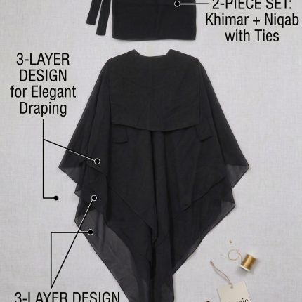 3 Layer Khimar Hijab Set with Niqab – Imported Chiffon 2 Piece Set | Free Size (Black)